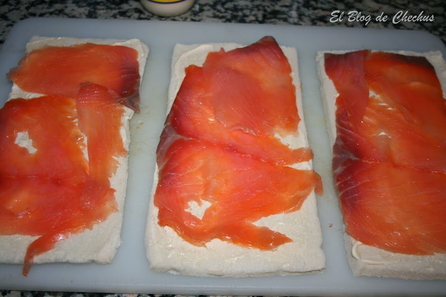 Es muy fácil de preparar. Normalmente se hace con una plancha de bizcocho que puedes encargar en cualquier horno, sino te atreves a hacerla en casa, claro. Pero esta vez, y con las prisas, se me ocurrió utilizar las planchas de pan de molde que vende Bimbo.