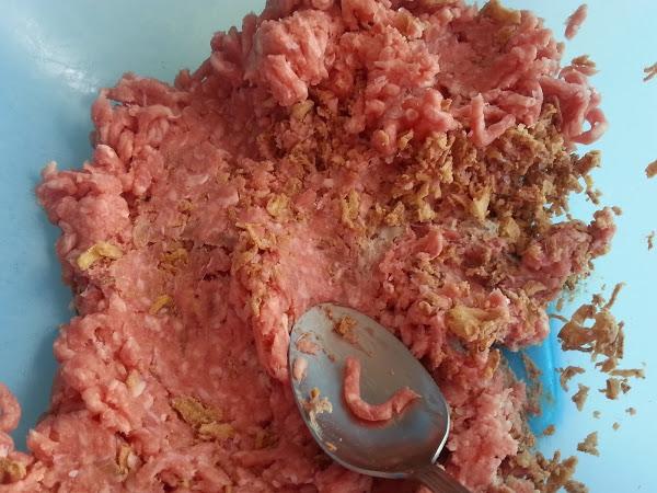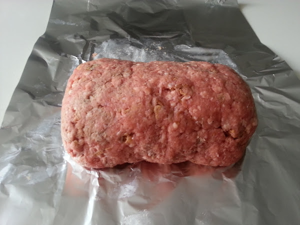 3. - Volvamos la carne sobre papel de aluminio y le camos forma de rollo, bien apretadito.