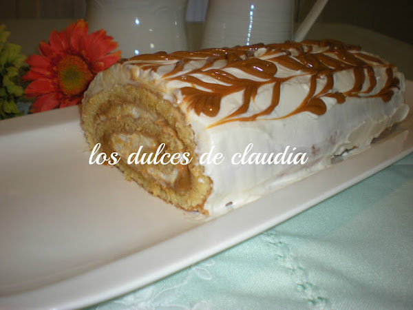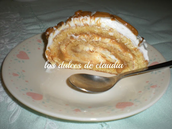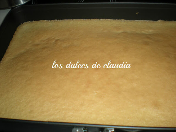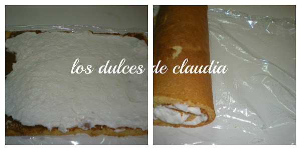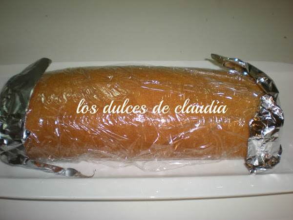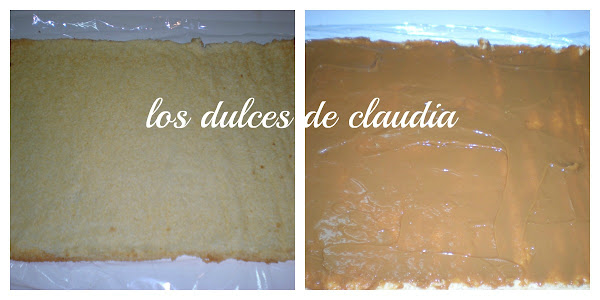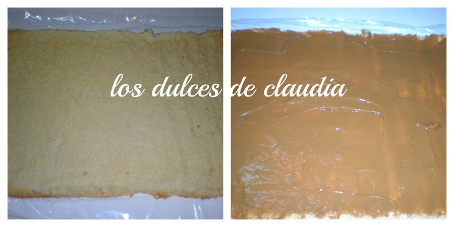 Poner la plancha de bizcocho sobre papel film y untar un poco de dulce de leche.