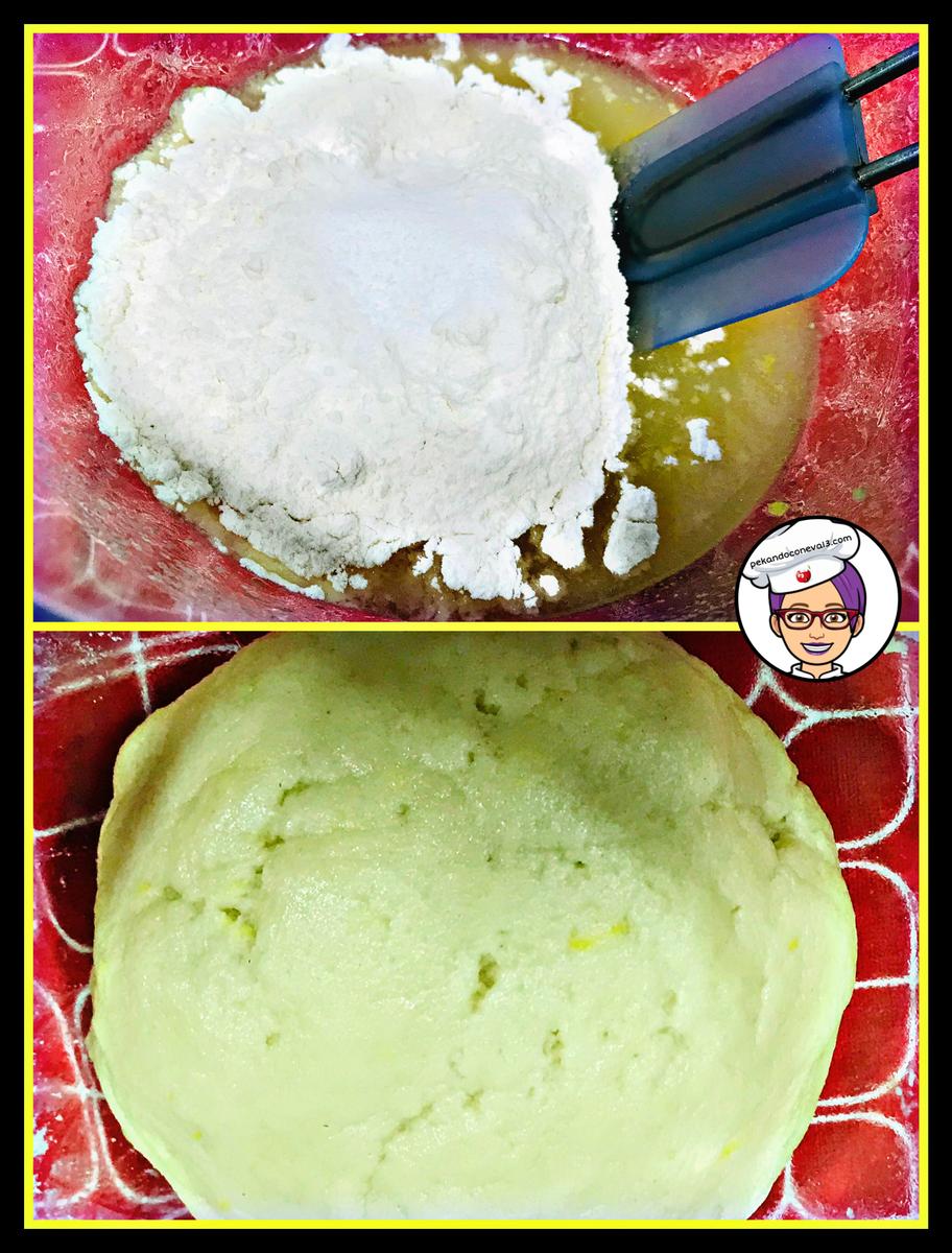 Ahora añadimos la mitad de la harina junto a los sobres lila y blanco y con una espátula lo mezclamos.