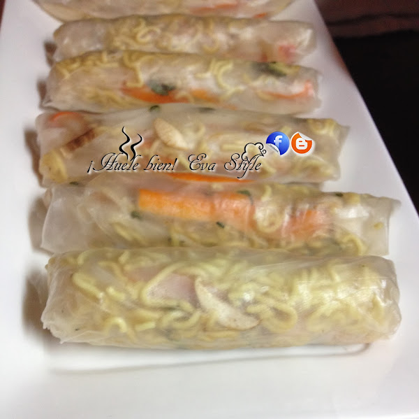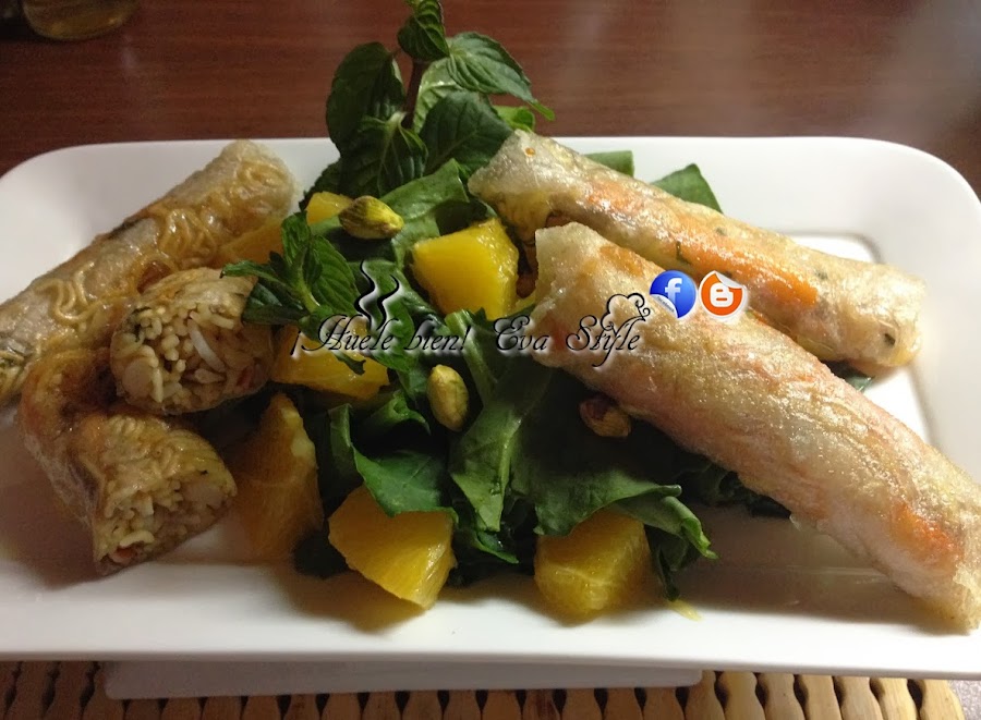 7.- Colocamos la ensalada en medio del plato, a ambos lados ponemos los rollos de arroz y aderezamos con la salsa, vertiendo por encina con una cuchara.