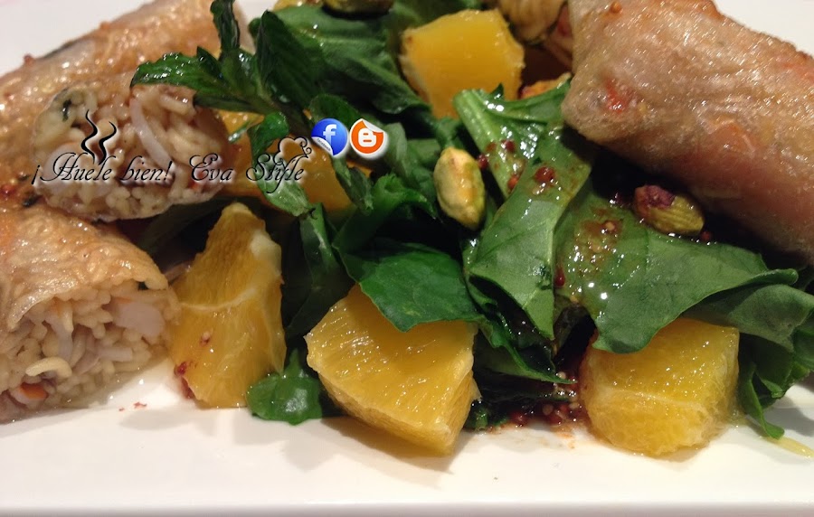 Un plato oriental acompañado por una ensalada mediterranea de espinacas, menta, gajos de naranja y pistachos. Aderezado todo con; vinagre de arroz, mostaza de Dijon, azúcar, zumo de limón, tomate ketchup y vinagre blanco.