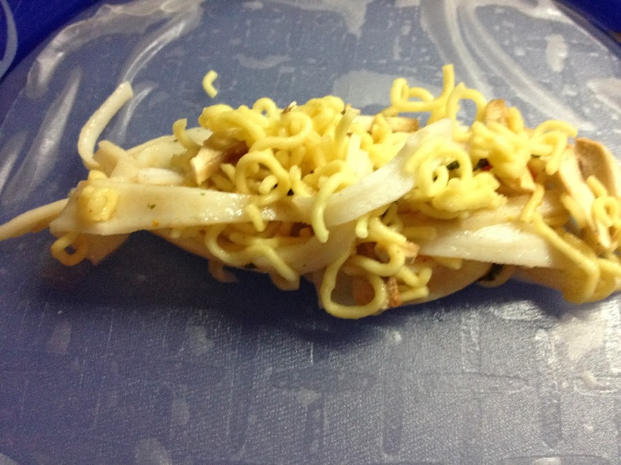 1- En una cacerola ponemos agua a hervir con un poco de aceite y una pizca de sal. Cuando el agua este caliente, la retiramos el fuego y ponemos los fideos chinos 5 minutos. Los separamos con cuidado y con la ayuda de un tenedor.