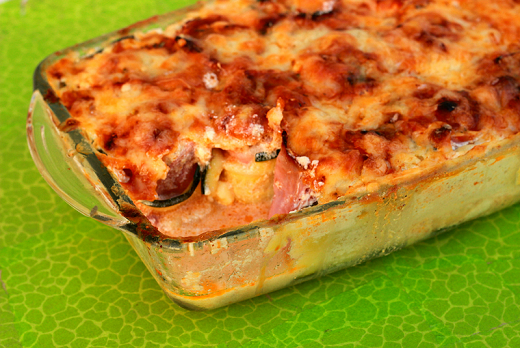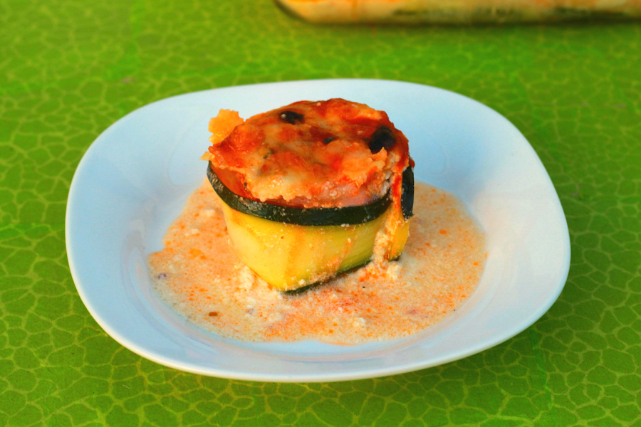 Cortamos el calabacín en láminas muy delgadas, cogemos dos láminas, coloca una encima de la otra pero desde la mitad, es decir, que la de arriba quede a la mitad de la de abajo, y sobre ellas colocamos una loncha de bacón (tocineta) una loncha de queso cortada por la mitad y una loncha de jamón cortado por la mitad. Hacemos un rollito y lo colocamos en el molde. Repetimos el procedimiento hasta terminar con todas las rebanadas de calabacín y que los rollos queden apretados en el molde.