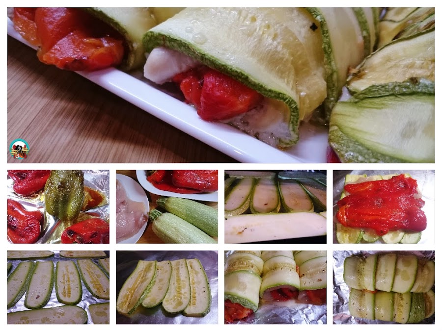 3.- Sobre una lamina de papel de aluminio ponemos varias laminas de calacacín juntas, sobre estas ponemos un filete grande de pechuga o dos si son pequeños, después los cubrimos con el pimiento asado. Los enrollamos con la ayuda del papel de aluminio. Así hasta completar los 4 rollos. Los ponemos todos en un placa cubierta con papel de aluminio o papel de horno, cocinamos los rollos 30 o 35 minutos. Retiramos del horno y servimos enseguida.