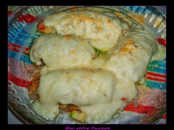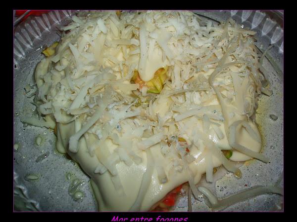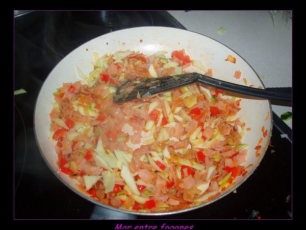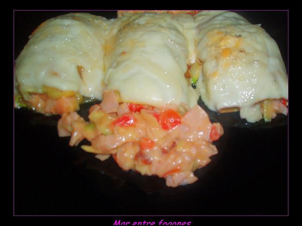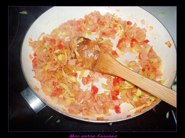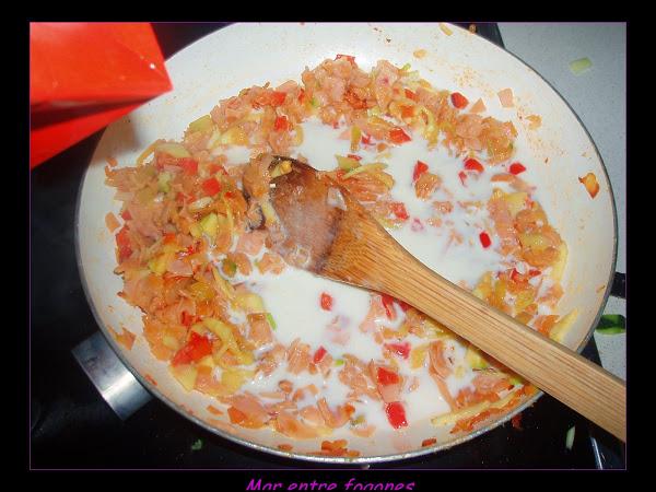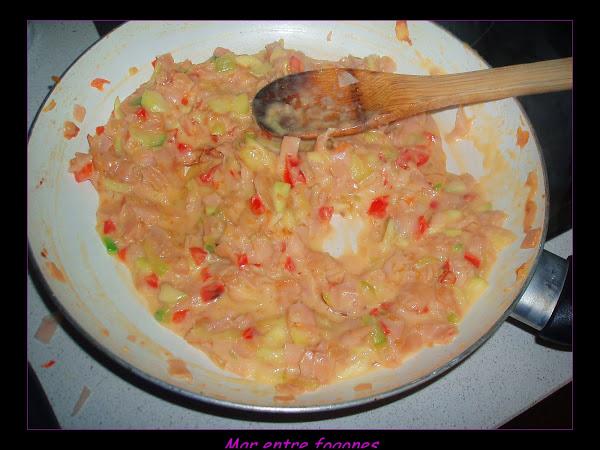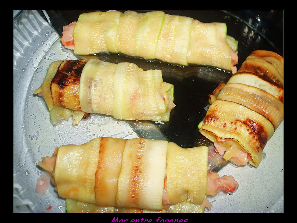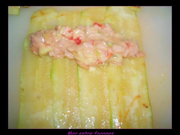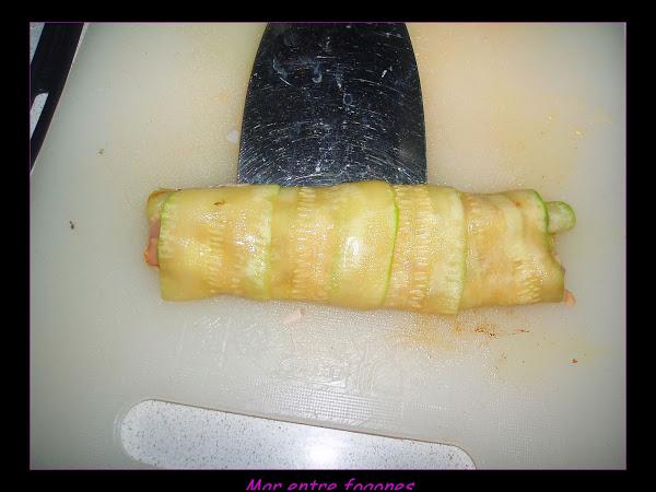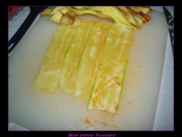 Añadimos el calabacin partido en dados, ( utilicé las laminas que eran pequeñitas para hacer los rollos).