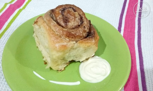 - Pasado ese tiempo de cocción los retiramos del horno y colocamos por encima de cada rollo una cucharada sopera de crema de leche y los llevamos de nuevo a hornear por 20 minutos mas o hasta que estén dorados en la superficie.