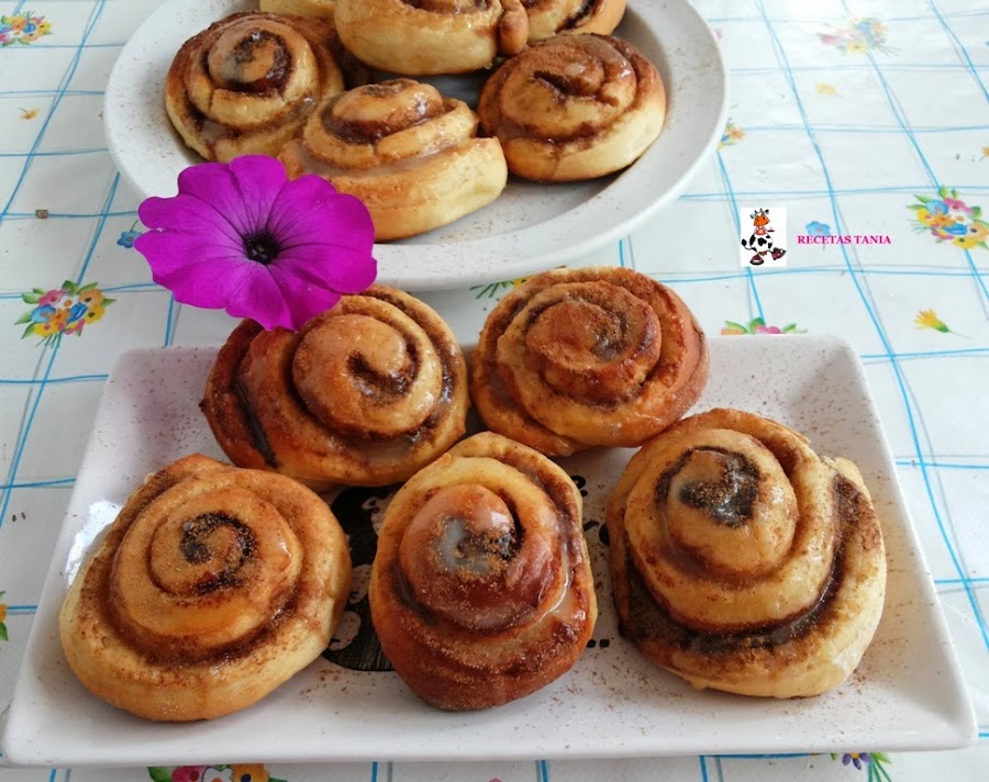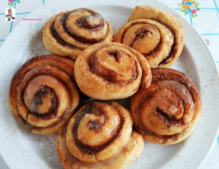 En un bol ponemos el zumo del limón y el de la naranja y vamos añadiendo el azúcar glass y removiendo con unas varillas hasta que tengamos la textura deseada. Una vez los rollos estén fríos añadimos la glasa por encima y espolvoreamos un poco de canela. Y listos para comer...