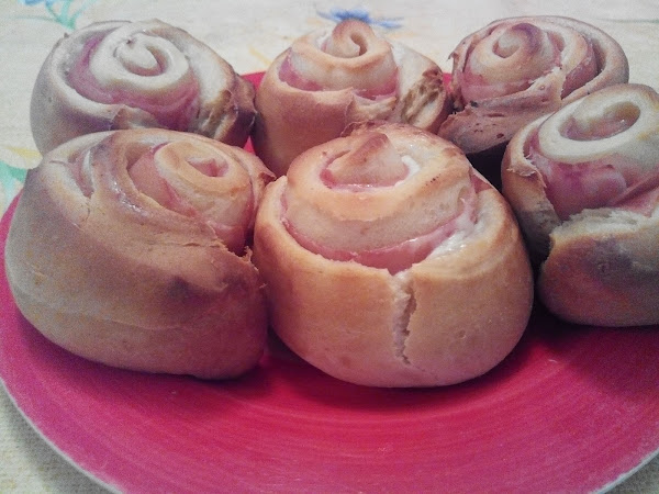 Os acordais que guarde un poco de masa? bueno pues la utilice para hacer otros rollitos que esta vez en vez de dulces los hice salados.Cuando estire la masa en vez de untar mantequilla unte queso crema y puse unas lonchas de jamon york y segui el procedimiento de enrrollar, cortar y poner en el horno despues de pintados con huevo a 180º durante unos 12-15 minutos.Estan deliciosossss mi niño se comio dos.