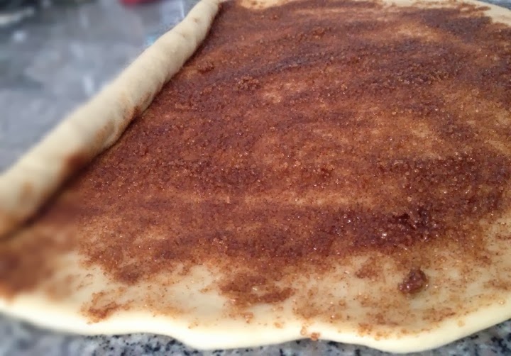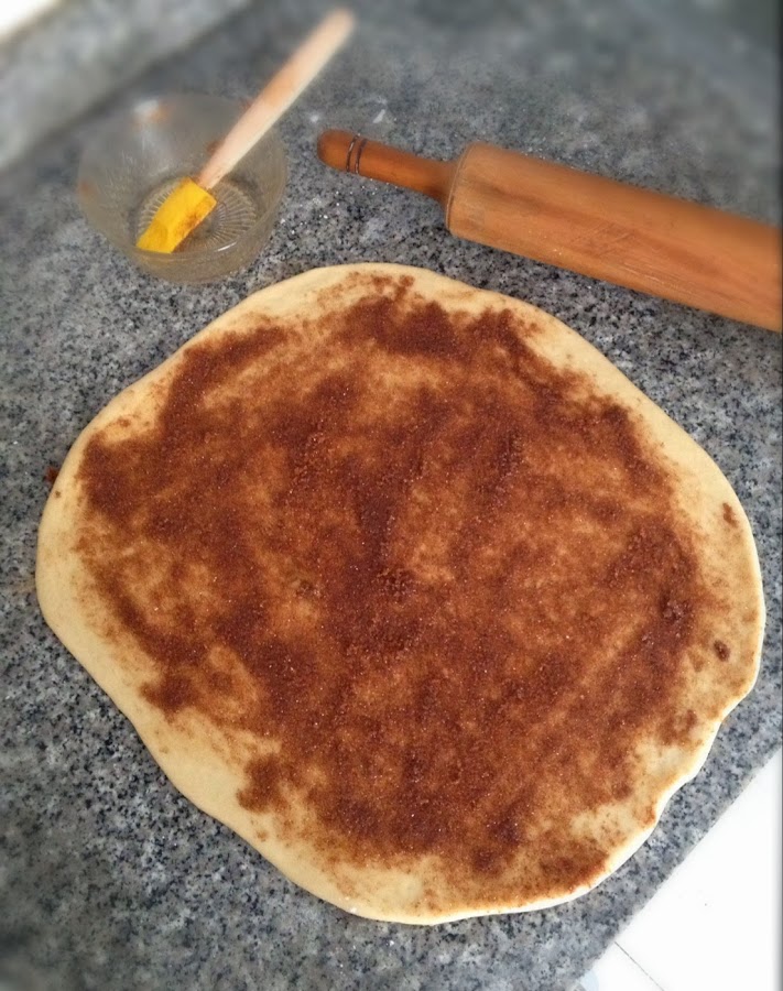 8. Repartir por todo el rectángulo la mezcla de azúcar, mantequilla y canela con la ayuda de una espátula o con tus manos.
