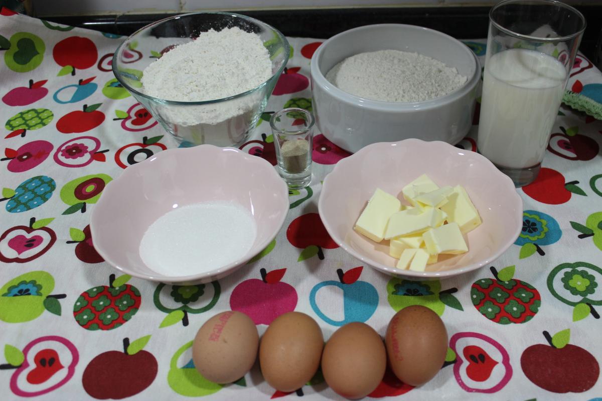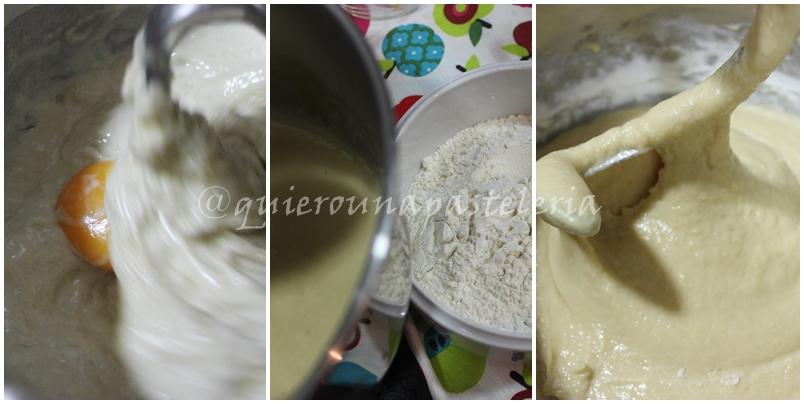 En la amasadora (también podéis hacerlo a mano) echamos la mitad de la mezcla de harinas con toda la levadura y a velocidad baja vamos incorporando la mezcla de la leche. Después los huevos uno a uno y cuando estén totalmente integrados añadiremos el resto de harina. Amasamos durante unos 5 minutos hasta obtener una masa elástica y brillante.