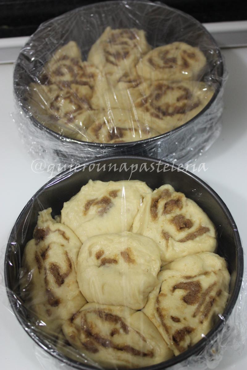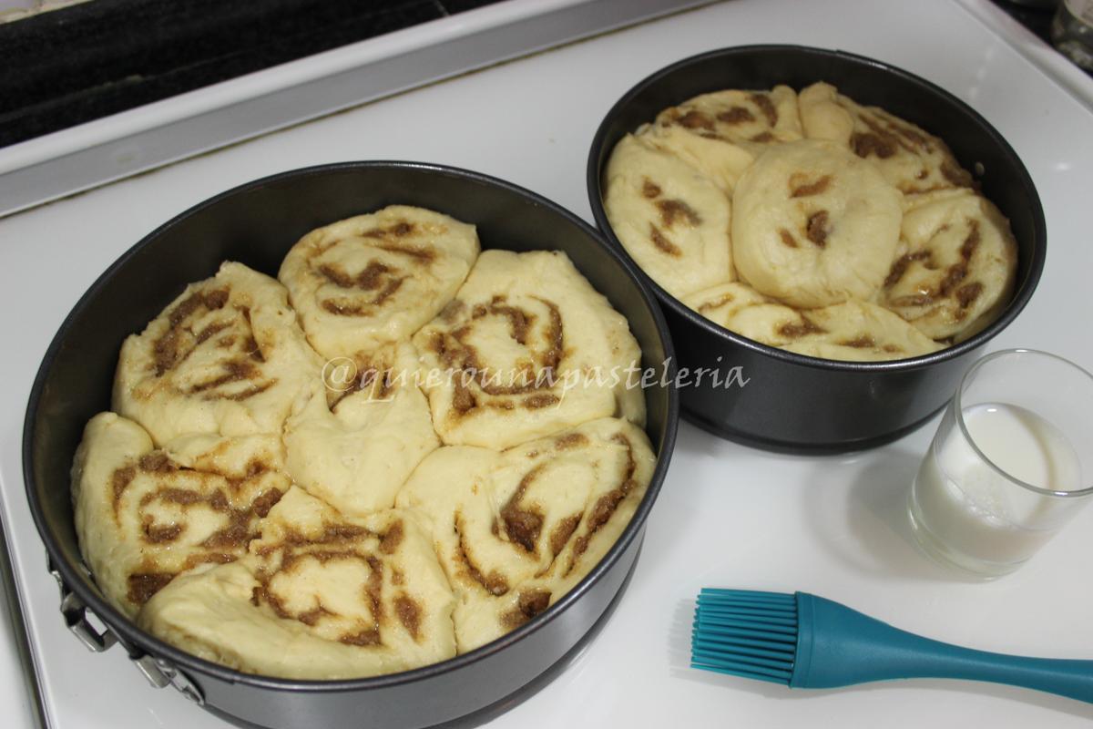Con estas cantidades me han salido dos moldes, uno de 15 cm y otro de 20 cm, 13 rollitos. Los colocaremos en los moldes previamente engrasados con spray o mantequilla, taparemos con film y esperaremos unos 30 minutos hasta que vuelvan a subir.