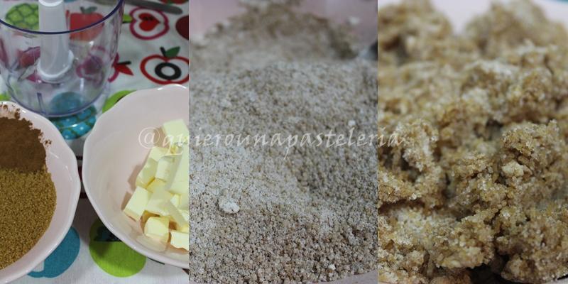 Mientras esperamos que la masa suba vamos a preparar el relleno, yo lo he puesto en la picadora, mantequilla fría, azúcar moreno, azúcar blanco y canela, os quedaran como unas ¨migas”. Reservaremos.