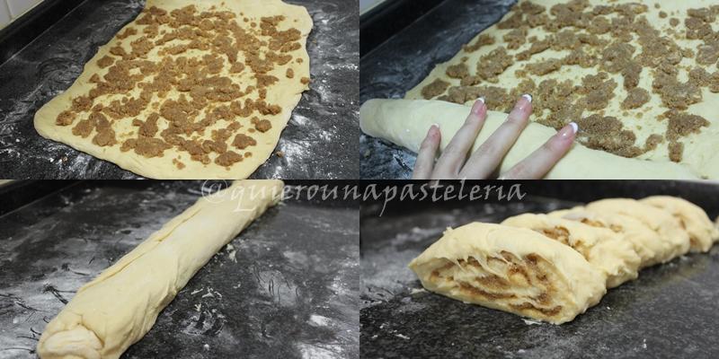 Una vez levada la masa en una superficie enharinada extenderemos la masa con ayuda de un rodillo hasta obtener un cuadrado de unos 40 cm. Esparcimos las “migas” por toda la masa presionando ligeramente dejando un par de dedos sin cubrir para poder cerrar la masa.