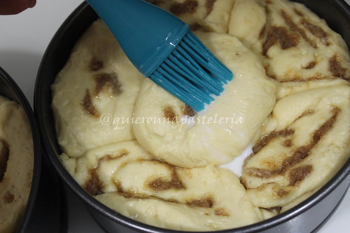 Pasado este tiempo quitamos el film y pintamos la masa con la leche para que brille. Los hornearemos durante 40 minutos, introduciendo un palillo para ver si sale seco… y listo!! Bueno… aun no… falta un detalle…. un poco de Toffee? Muy fácil!