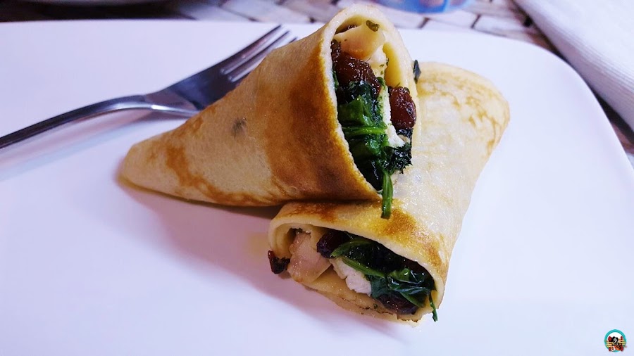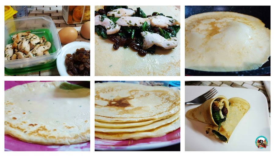 perejil fresco. Freímos las pechugas en la sartén con un poco de aceite de oliva. Lavamos las espinacas, las secamos bien con papel de cocina y cortamos en trozos medianos.Las salteamos la sartén con un poco de aceite de oliva y las pasas. Salpimentamos al gusto, incorporamos las tiras de pollo y cocinamos un minuto más. rellenamos cada crepe con un poco de espinacas con pollo. Enrollamos el crepe y lo partimos por la mitad.
