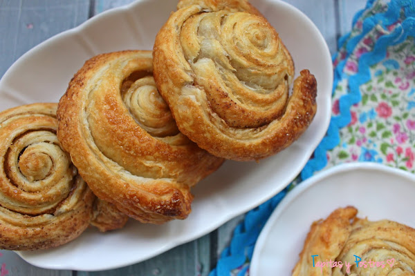 Tocaba llevar dulce a la comida familiar y el tiempo se me habia echado encima, asi que tirando de lo que había en casa, improvise estos rollos de hojaldre y canela que no tienen nada que envidiarle a los famosos cinamon rolls suecos, bueno, la masa es distinta claro, pero os aseguro que están buenísimos.