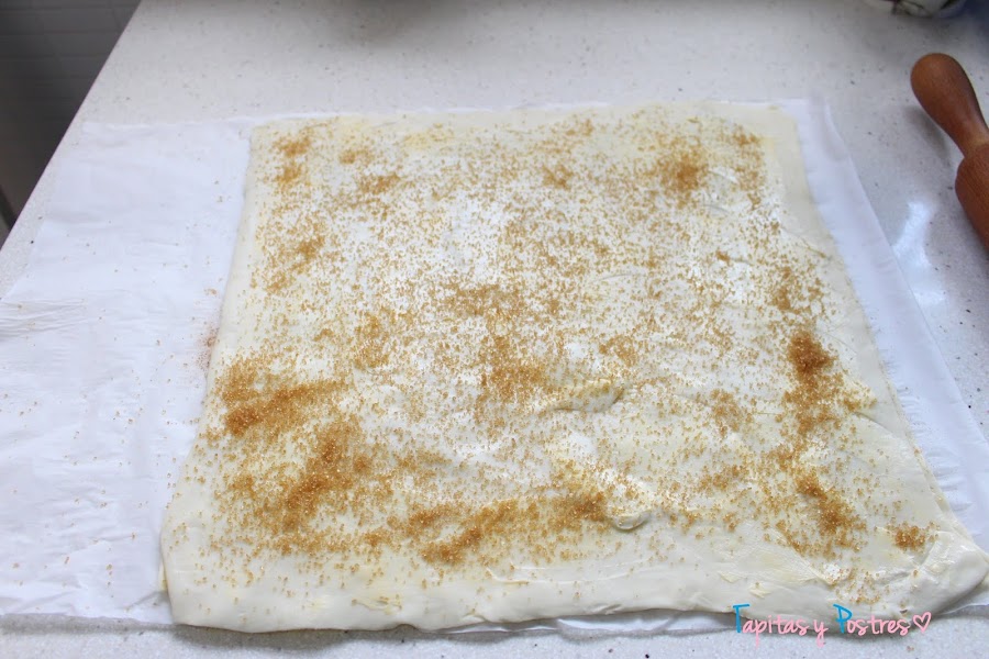 Extendemos las dos planchas de hojaldre. A una de ellas le untamos la mitad de la mantequilla por toda la superficie, encima espolvoreamos la mitad del azúcar y la canela.