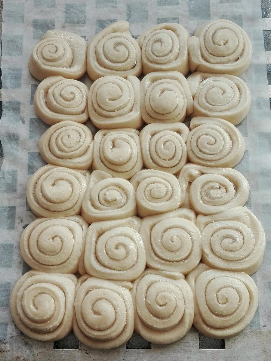 Cortamos en rodajas de 1 dedo de grosor mas o menos, nos saldrán aprox 16 porciones de cada cilindro de masa.Si quisieras unos rollos mas gorditos y por tanto mas esponjosos córtalos en porciones mas anchas
