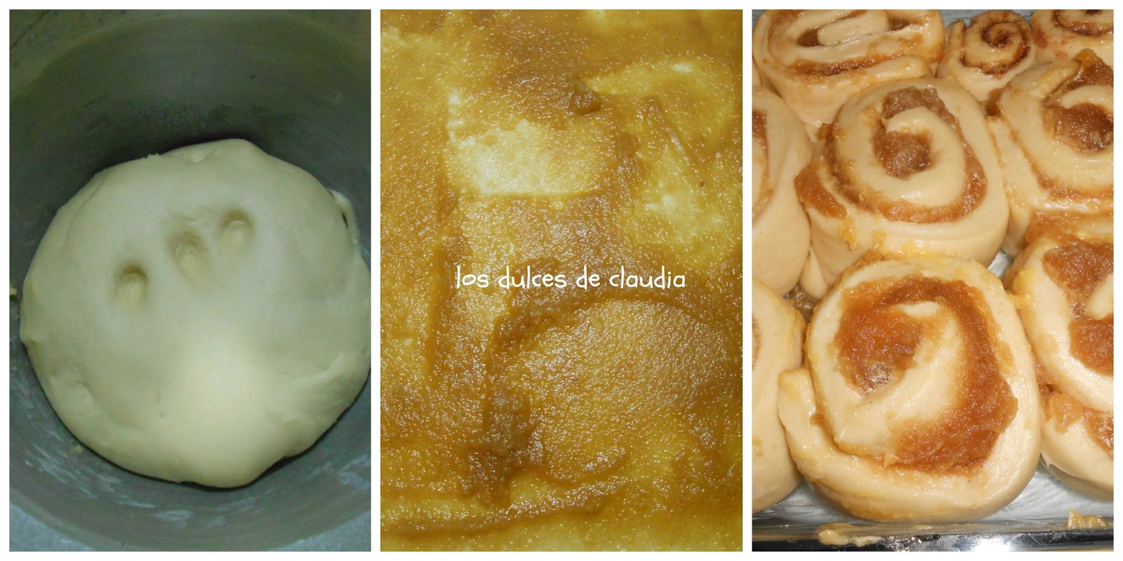 Pasada la hora y media ,estirar la masa, untar con margarina, azúcar y canela, por último el puré, enrrollar y cortar.