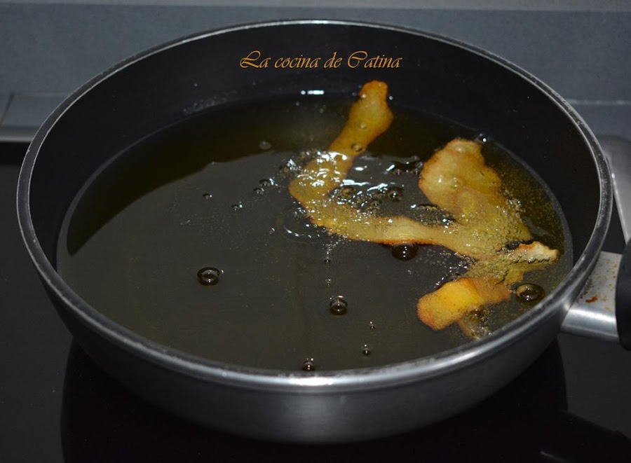 En una sartén ponemos a calentar el aceite para freír las cortezas de limón y de naranja.