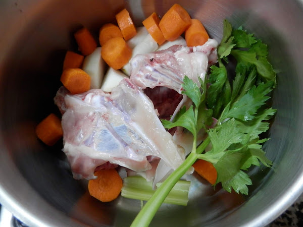 En primer lugar, vamos a cocer la pechuga en un caldo que haremos con agua, zanahoria, apio, puerro y nabo.