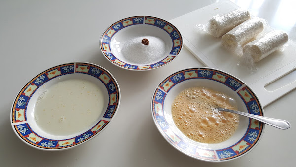 11. - Ponemos un plato con azúcar y una pizca de canela y la removemos bien. Otro plato con el huevo batido. Y otro plato con la leche infusionada.