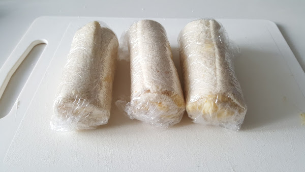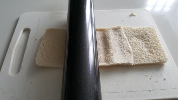 4. - Pasamos al montaje de los rollos..... cogemos 3 rebanadas y les quitamos la corteza (o utilizáis de las rebanadas que venden sin corteza.).