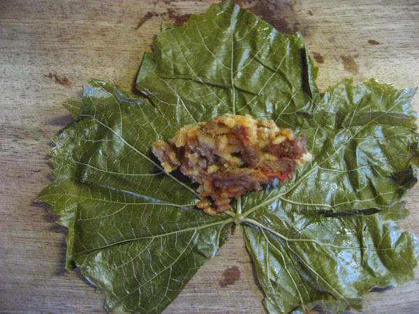 4º " Bueno ya lo tenemos casi todo, así que empezamos a crear los paquetitos. Cogemos una hoja de vid, la estiramos encima de la tabla de cortar, le añadimos una cucharada del arroz con carne y enrollamos, primero plegamos los laterales y seguidamente enrollamos la hoja, más o menos tienen que quedar como en la foto.