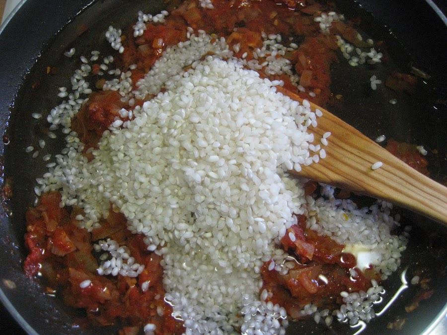 3º " En la misma sartén ponemos la carne picada y la sofreímos, cuando ya la tengamos hecha le añadimos el sofrito de cebolla y tomate a la sartén, le echamos el arroz, unos dos puñados (bueno un vaso mediano entero), removemos y le añadimos el caldo de verduras y el pimentón picante, el caldo puede ser perfectamente agua con dos pastillas de caldo de verduras, marca?, la que más os guste.