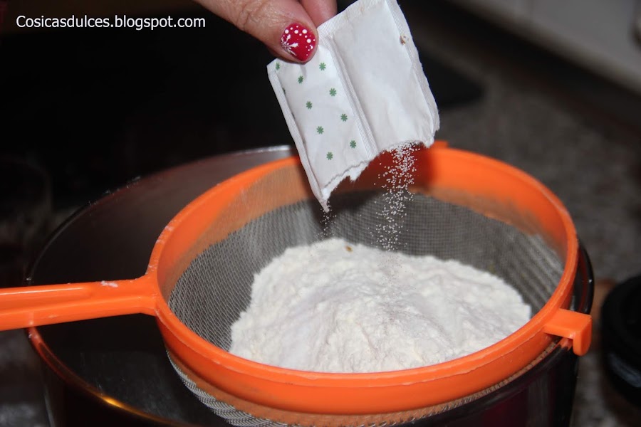 Colocamos en un bolla harina tamizada y el azúcar, vertemos sobre ella las gaseosas y mezclamos.