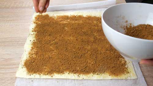 Encima de la mantequilla echamos el relleno que hemos preparado de azúcar, canela y nuez moscada. La mantequilla va a hacer que el relleno quede pegado al hojaldre.