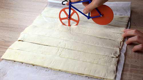 Después, con un cuchillo o corta pizza cortamos la masa en tiras de más o menos 1,5 o 2 centímetros de grosor.