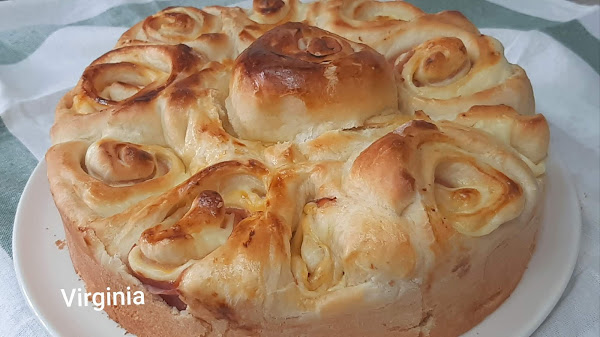 4.- Con un rodillo, extiende la masa dándole forma rectangular (aprox. 30x40 cm). Cubre la superficie con las lonchas de jamón serrano y de queso y reparte la mantequilla. Forma un rollo comenzando por la parte más ancha. Corta en 8-9 rodajas y colócalas en el molde preparado. Pincela la superficie con huevo batido.