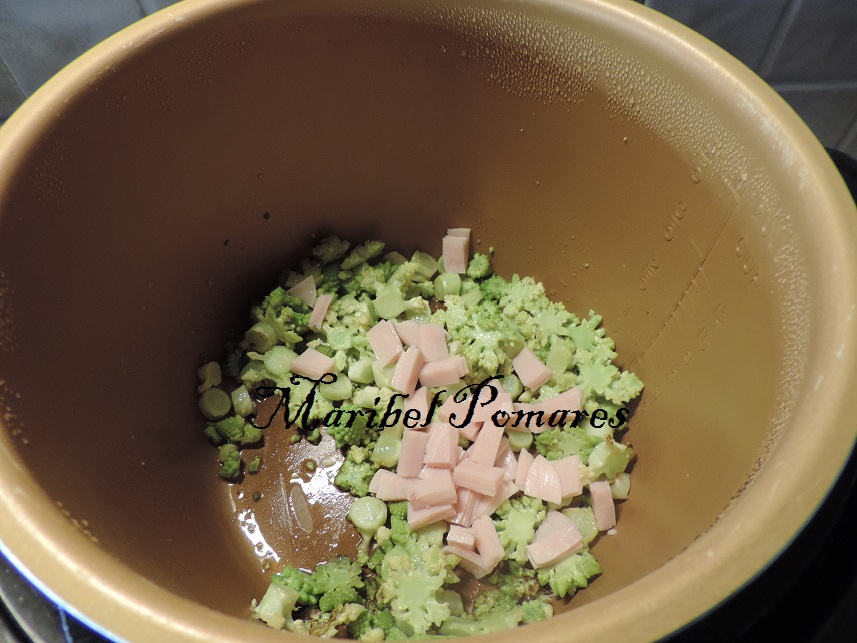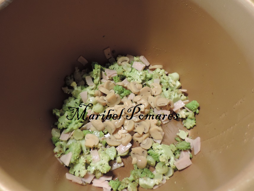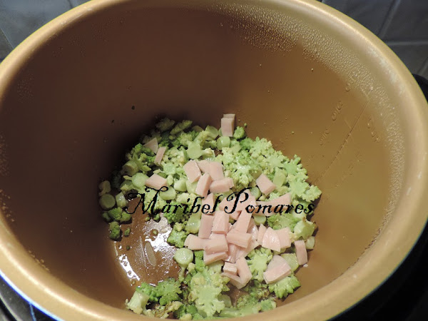 Cortamos la romanesca y la ponemos con el aceite y sal en la cubeta de la olla.