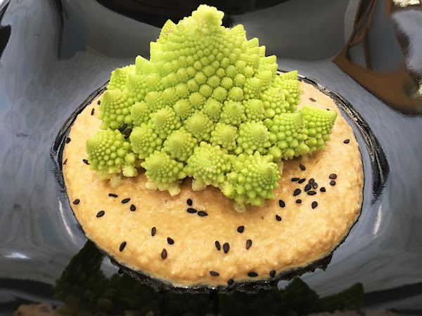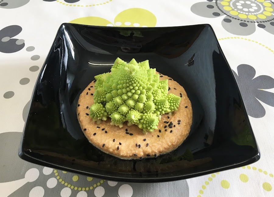 - Emplata con un poco de salsa en la base, el romanesco encima y espolvorea unas semillas de sésamo negro por encima para decorar.