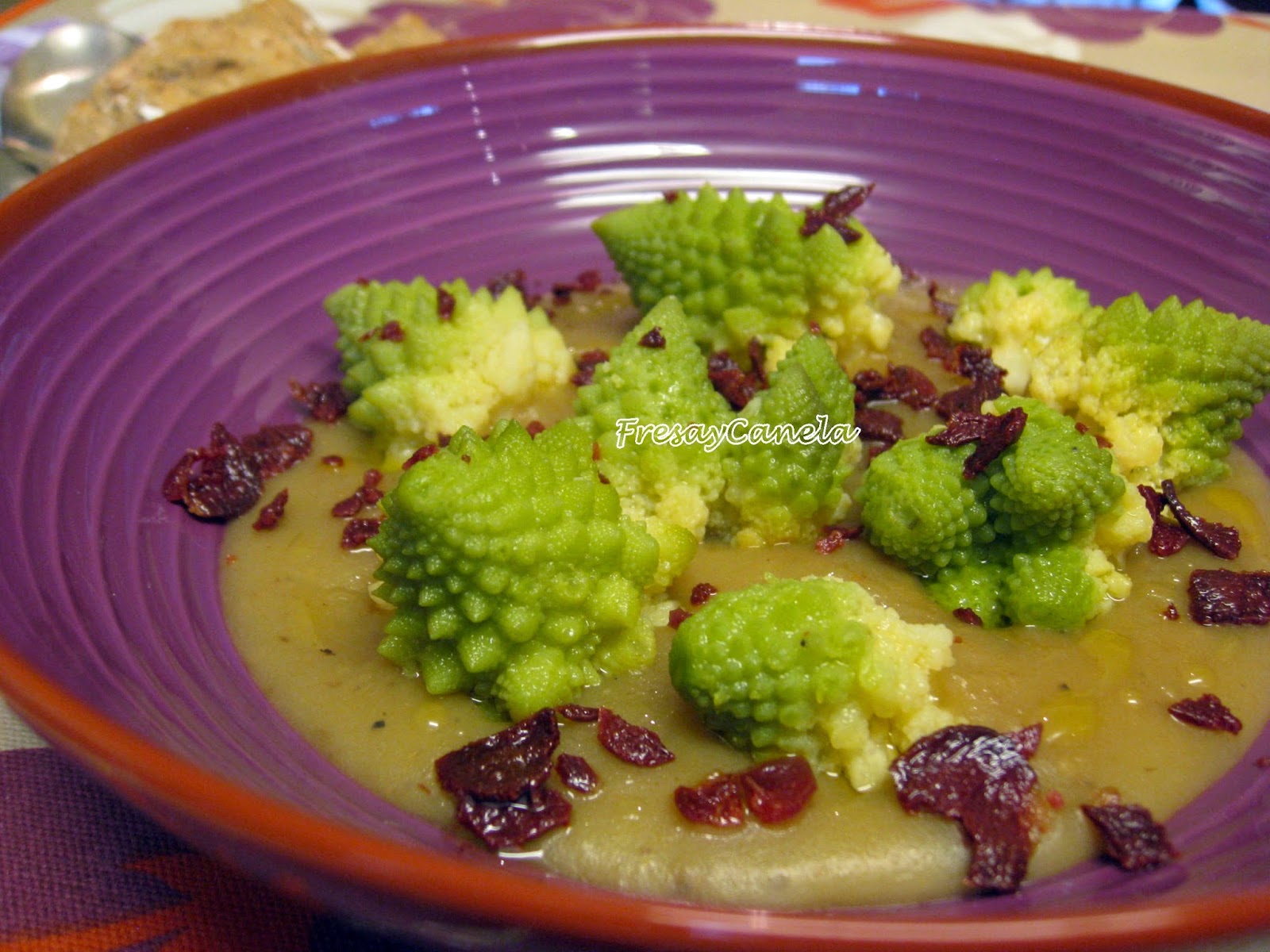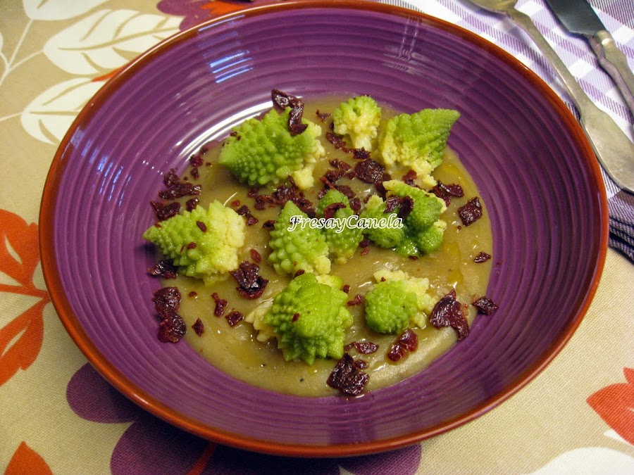 Tengo que decir que en casa tomamos bastante romanescu (que como sabéis es un híbrido de brécol con coliflor, como todas las especies de esta familia, es rico en vitamina C, fibra soluble y carotenoides) lo tomamos al vapor sin más aunque en esta receta esta vestido de fiesta.