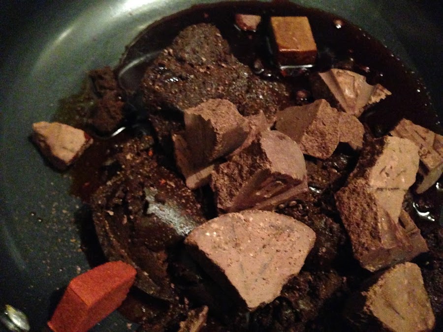 Ahora si vamos a preparar el mole, en una cazuela vamos a colocar el mole (no pongo aceite, uso el mismo del mole) las tabletas de chocolate y poco a poco agregamos el caldo de camarones que ya habíamos hecho (si usamos el caldo no agregamos ni el cubo de consomate ni el cubo de camarones) y vamos a tener la flama baja y removemos lentamente no podemos dejar solo el mole,