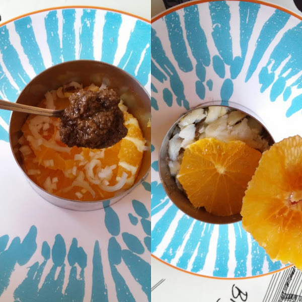 Montamos con un aro redondo: Una primera capa de naranja en lonchas. Bacalao desalado y olivada. Repetimos.
