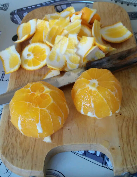 Pelamos bien la naranja para que no nos quede nada de la piel blanca. Hacemos lonchas finas con una y gajos con la otra.