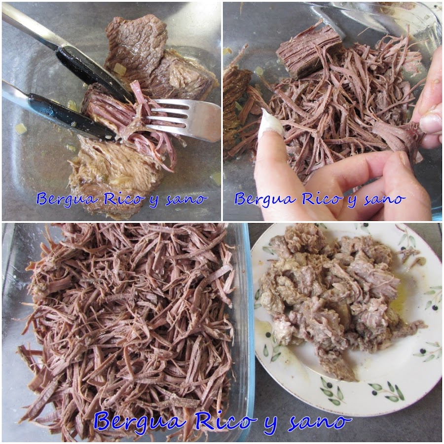 5. Para desenhebrarla podemos usar un tenedor y las manos. Si nos encontramos trozos de grasa, los retiramos. Yo empecé con pinzas y tenedor porque tenía un corte en un dedo, pero, la verdad, es un mucho más divertido y eficiente con las manos.