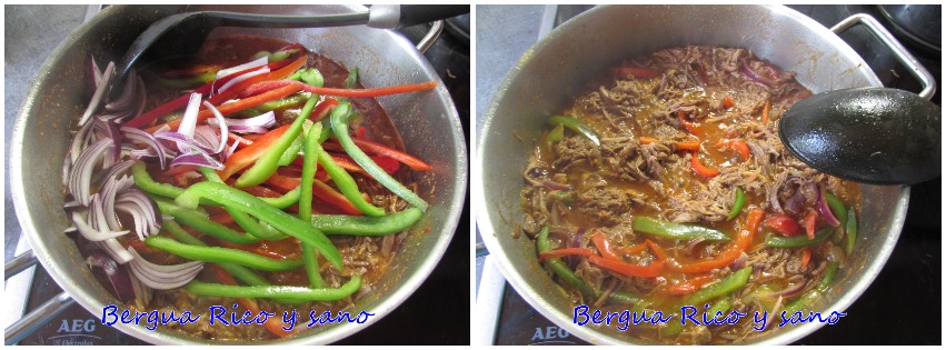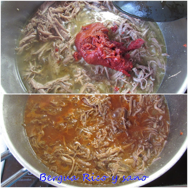 6. Calentamos una cucharada de aceite en una sartén y añadimos la carne desenhebrada para que coja un poco de cuerpo, pero sin dejar que se fría. En seguida añadimos 500 ml del caldo de la preparación anterior y la pasta de tomate y vamos a remover hasta que se disuelva y se mezcle del todo. Lo dejamos al fuego unos minutos hasta que empiece a hervir y se vean las burbujas en la superficie.