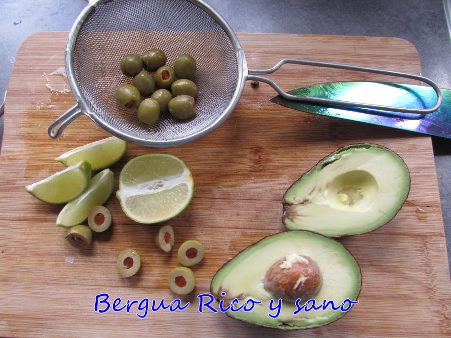 8. Las aceitunas rellenas (partidas y/o enteras) y el cilantro los añado al final para que se mantengan frescos y porque no a todo el mundo le gustan las aceitunas, así que, si en casa hay alguien que no quiera aceitunas o cilantro, se puede sacar a parte a la mesa.