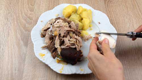 Un trozo de cebolla Lo primero que vamos a hacer es desmenuzar bien la carne. En mi caso he usado restos de carne de pollo, carne de ternera, un trozo de morcilla (también puede ser chorizo o ambos), un trozo de tocino y unas cuantas de patatas que me sobraron.