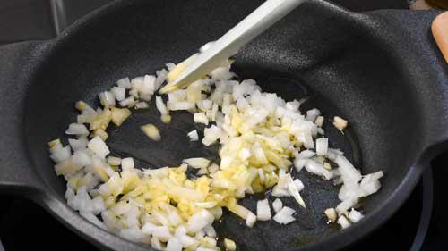 A continuación, en una sartén echamos un buen chorreón de aceite de oliva, lo ponemos a calentar y cuando esté listo agregamos los ajos troceados y la cebolla cortada en dados pequeños.
