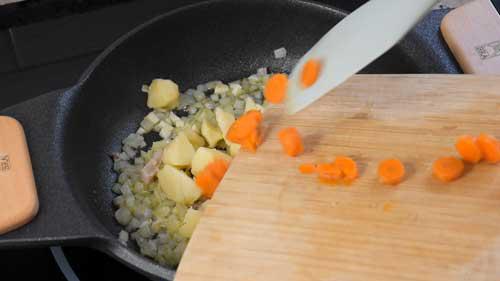 Después echamos las zanahorias y las patatas troceadas, damos una vuelta y dejamos sofreír unos minutos más.