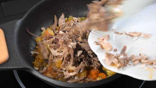 Luego, incorporamos la carne a la sartén, mezclamos con el resto de ingredientes y sofreímos por 3 o 4 minutos.