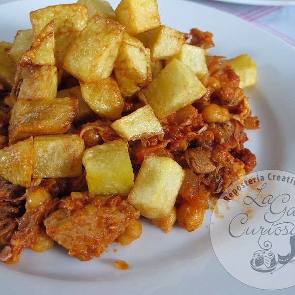 Para acompañar se fríen patatas cortadas en cuadrados medianos, la cantidad es al gusto de cada uno. Servir debajo la ropa vieja y por encima las patatas fritas.