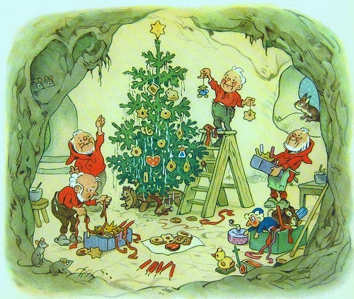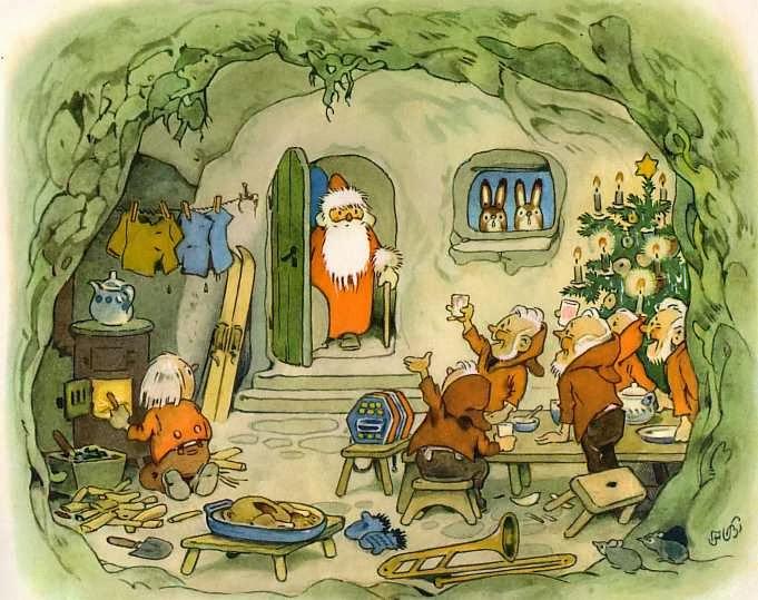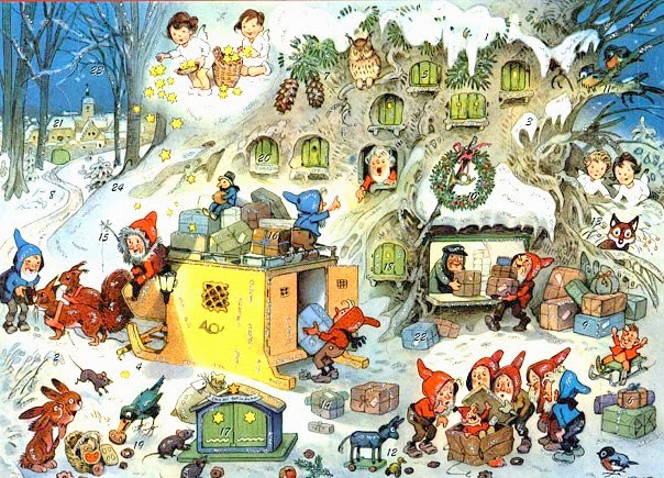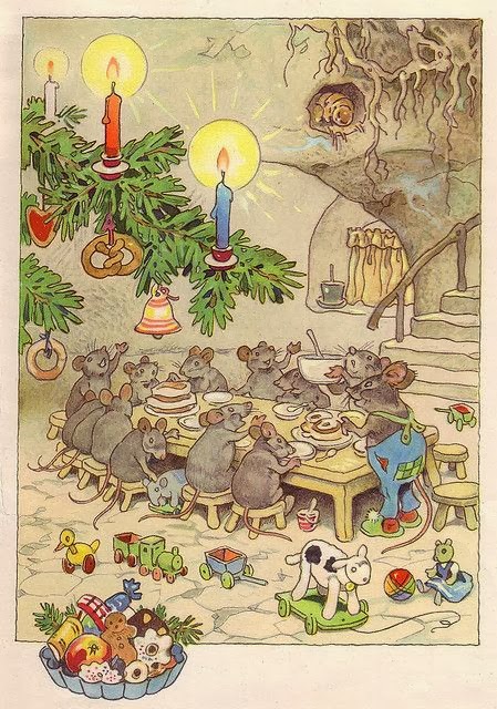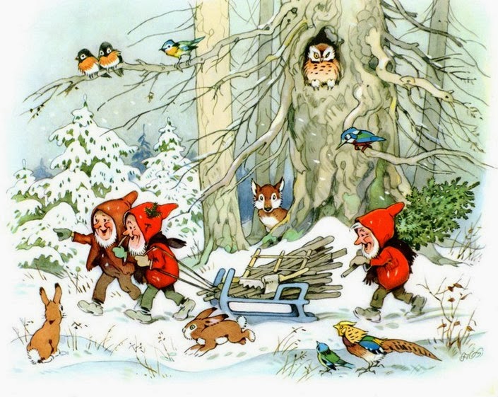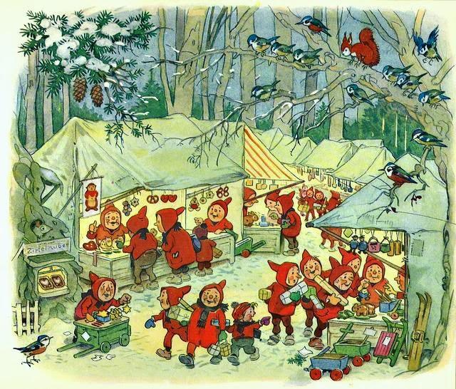 Y para decorar esta Tarjeta Navideña, de nuevo, cuento con las ilustraciones del alemán FRITZ BAUMGARTEN. Hacía tiempo que estas acuarelas andaban empujando, con sus coloreadas manos, la tapa del "arcón de ideas" y, por fin, ha llegado el momento de dejarlas salir.