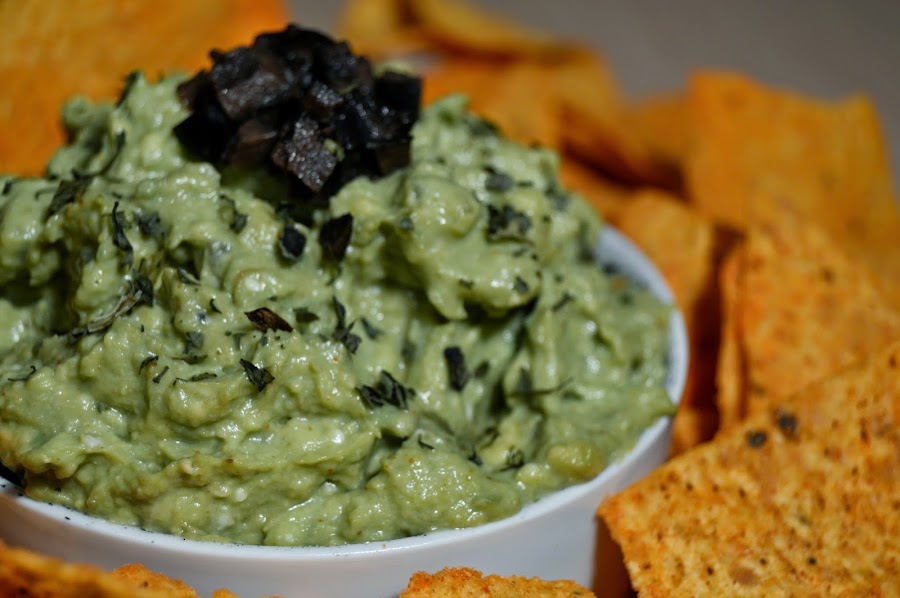 Se decora con las olivas picadas, con cilantro, con un poco de pimentón o parecido; se coloca en un bol en el centro de un plato rodeado de nachos y punto.